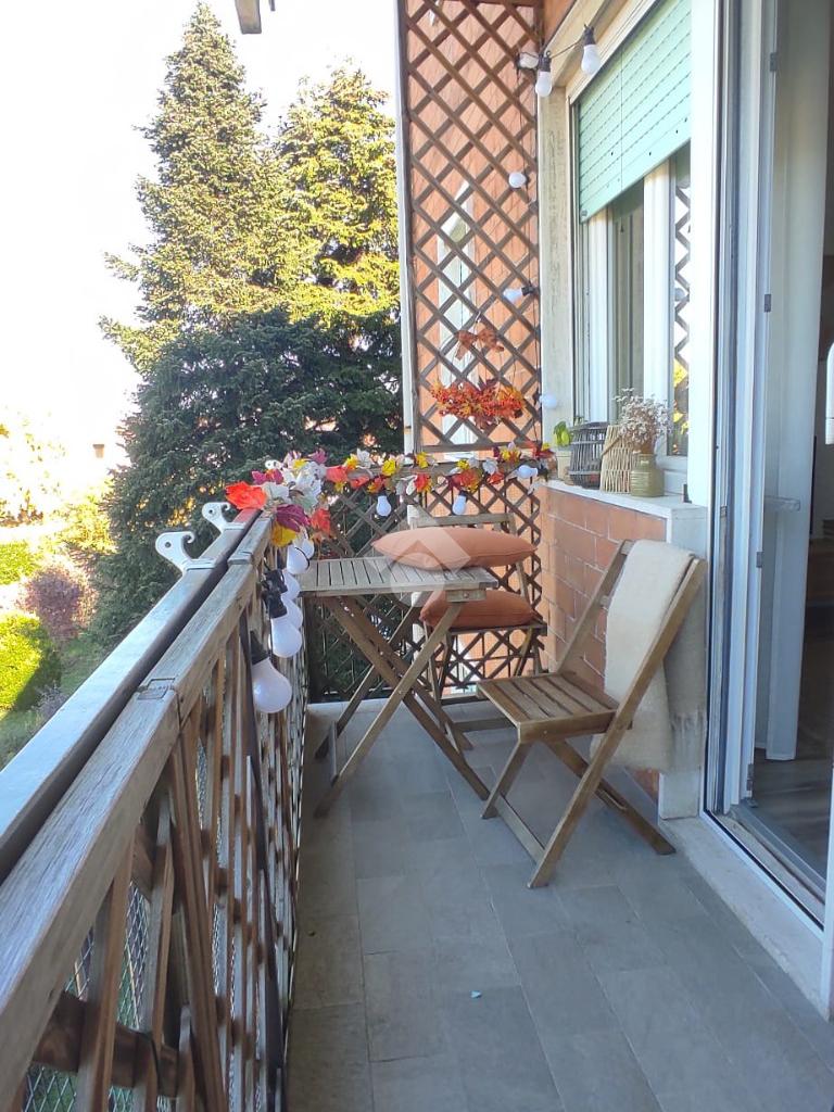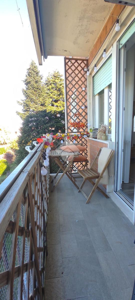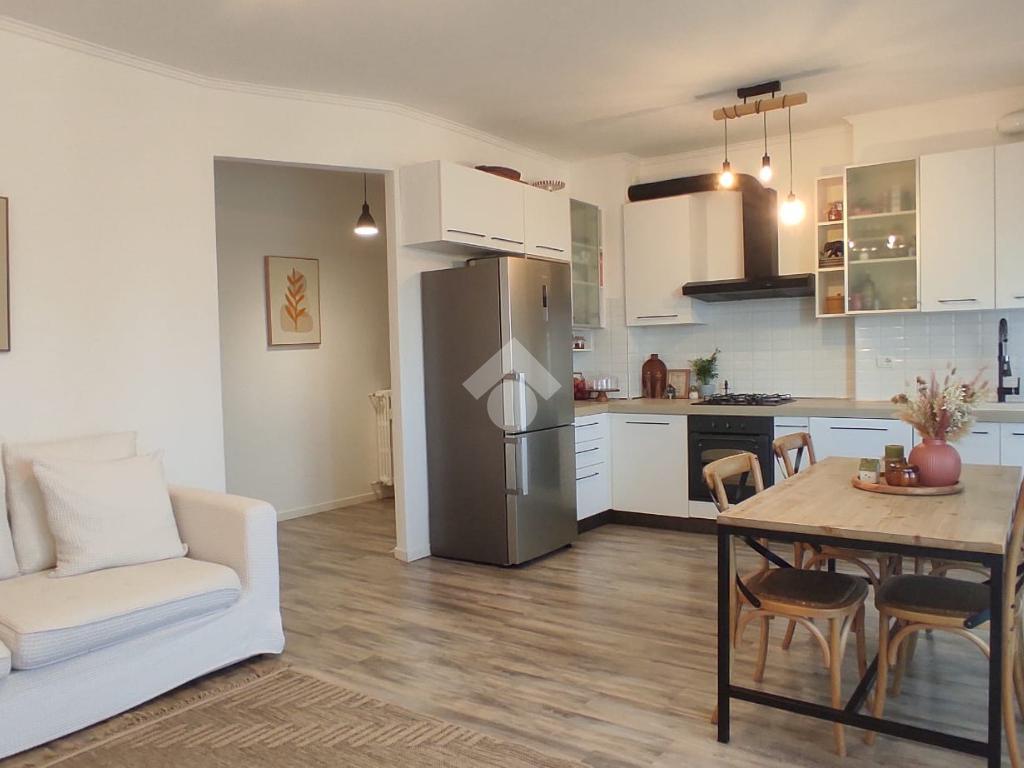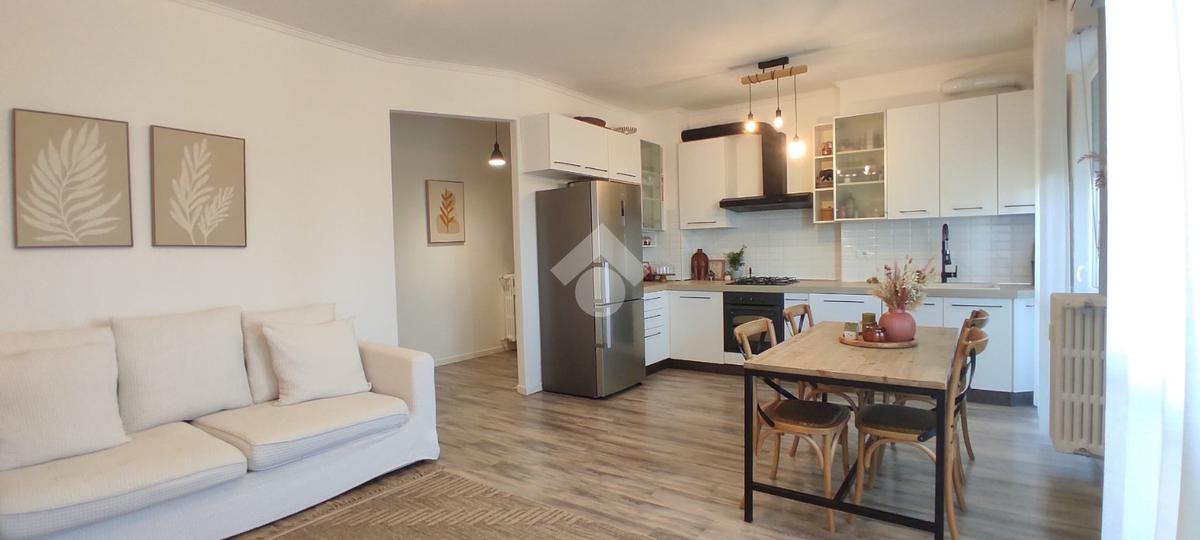 Zona giorno luminosa con angolo cottura e soggiorno affacciato su un comodo balcone, ideale per godere di momenti di relax all’aperto.