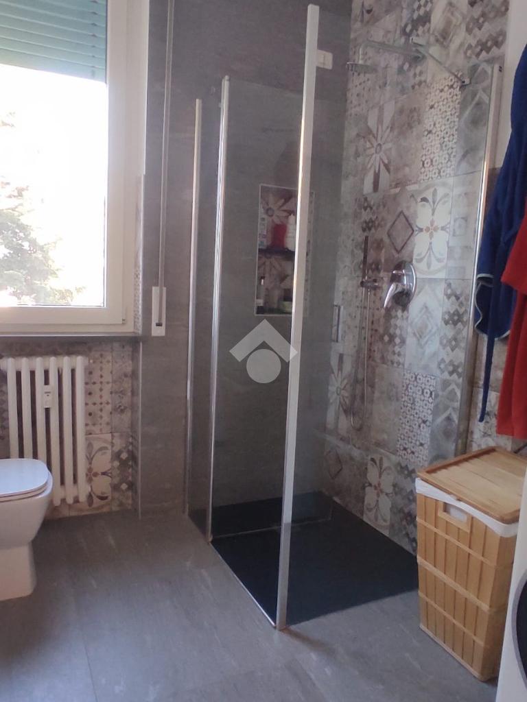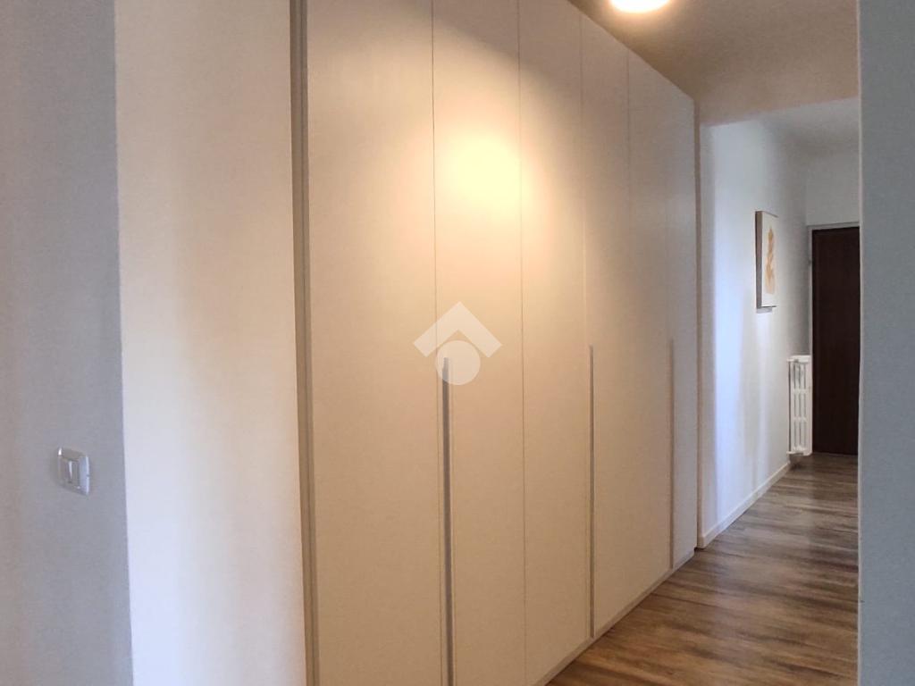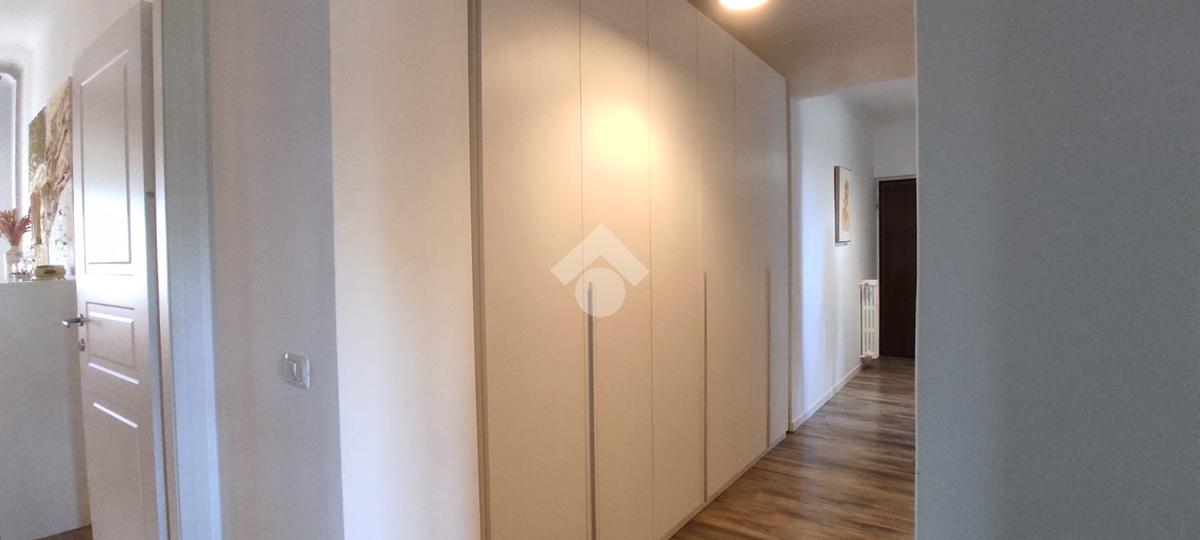 Corridoio attrezzato con armadio a muro che conduce alla camera matrimoniale, alla seconda camera doppia e al bagno finestrato, dotato di ampia doccia e finiture contemporanee.